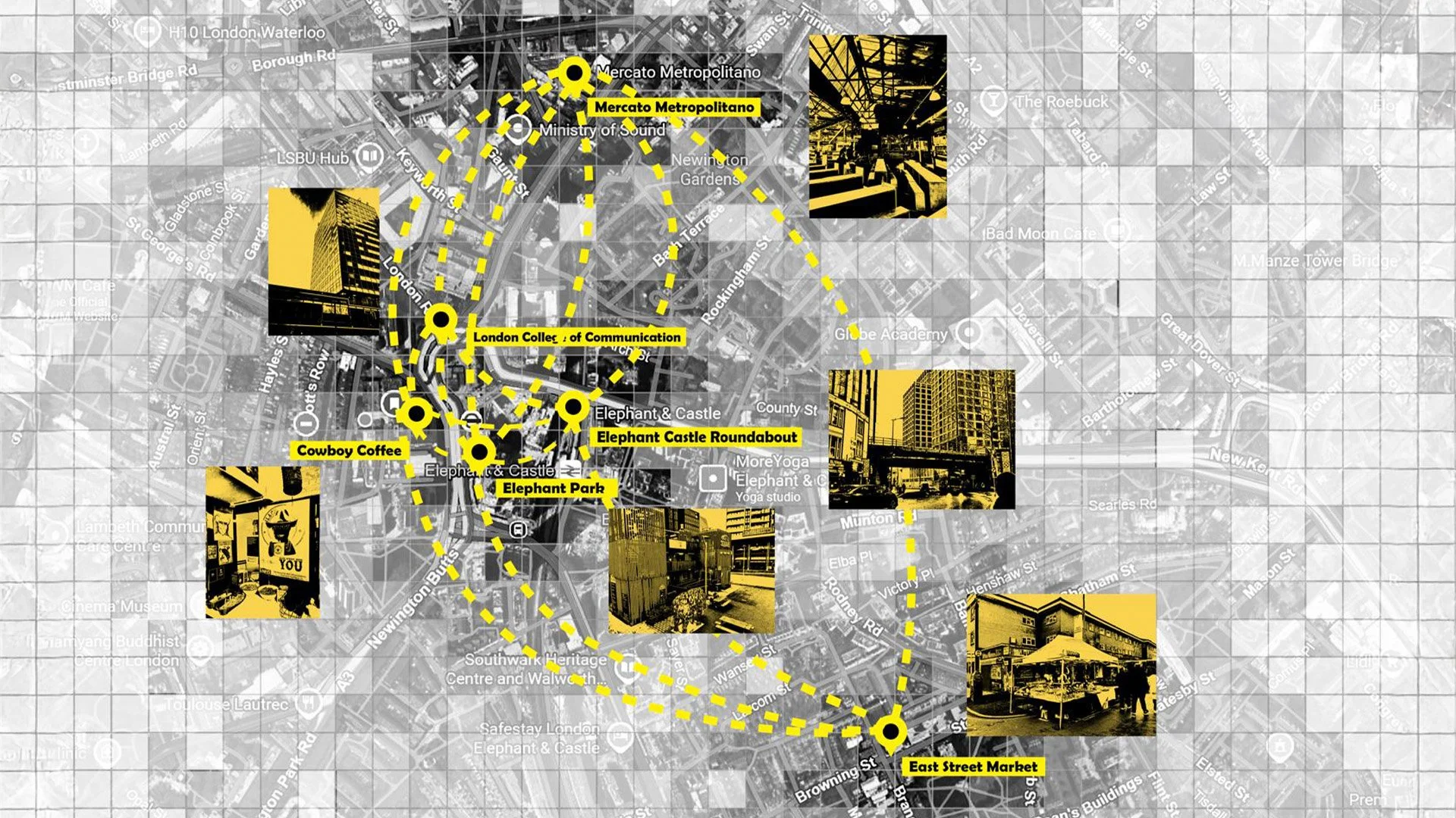 Fig. 2. Map showing the six locations: Black Cowboy Coffee, East Street Market, Mercato, Elephant Park, Elephant & Castle roundabout and LCC. Designed by Yihan Zhong.
