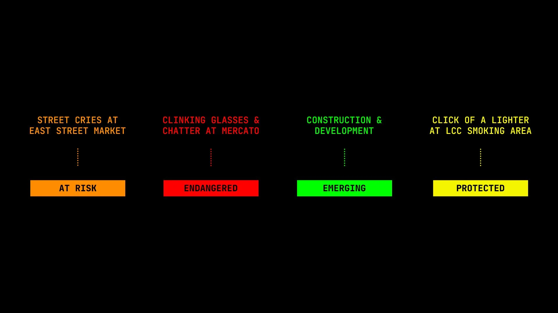 Inspired by the language of conservation, we categorised sounds into: protected, at risk, endangered and emerging. The recordings were analysed using a qualitative approach, drawing on our interviews to inform how the sounds were grouped. This framework allowed us to reflect on how certain sounds might disappear, persist or develop as the neighbourhood changes. For example, street cries from East Street Market were marked as at risk, reflecting traders’ concerns that the market has become quieter. With Mercato soon to be replaced by new housing developments, we categorised sounds there, like glasses clinking and chatter, as endangered.