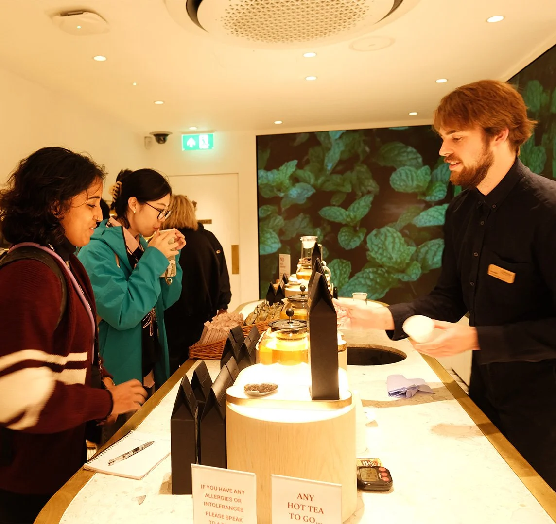 Fig. 1. Twining store showcases its history, photography by author. Tea tasting experience, photography by Shuairuge Shu.