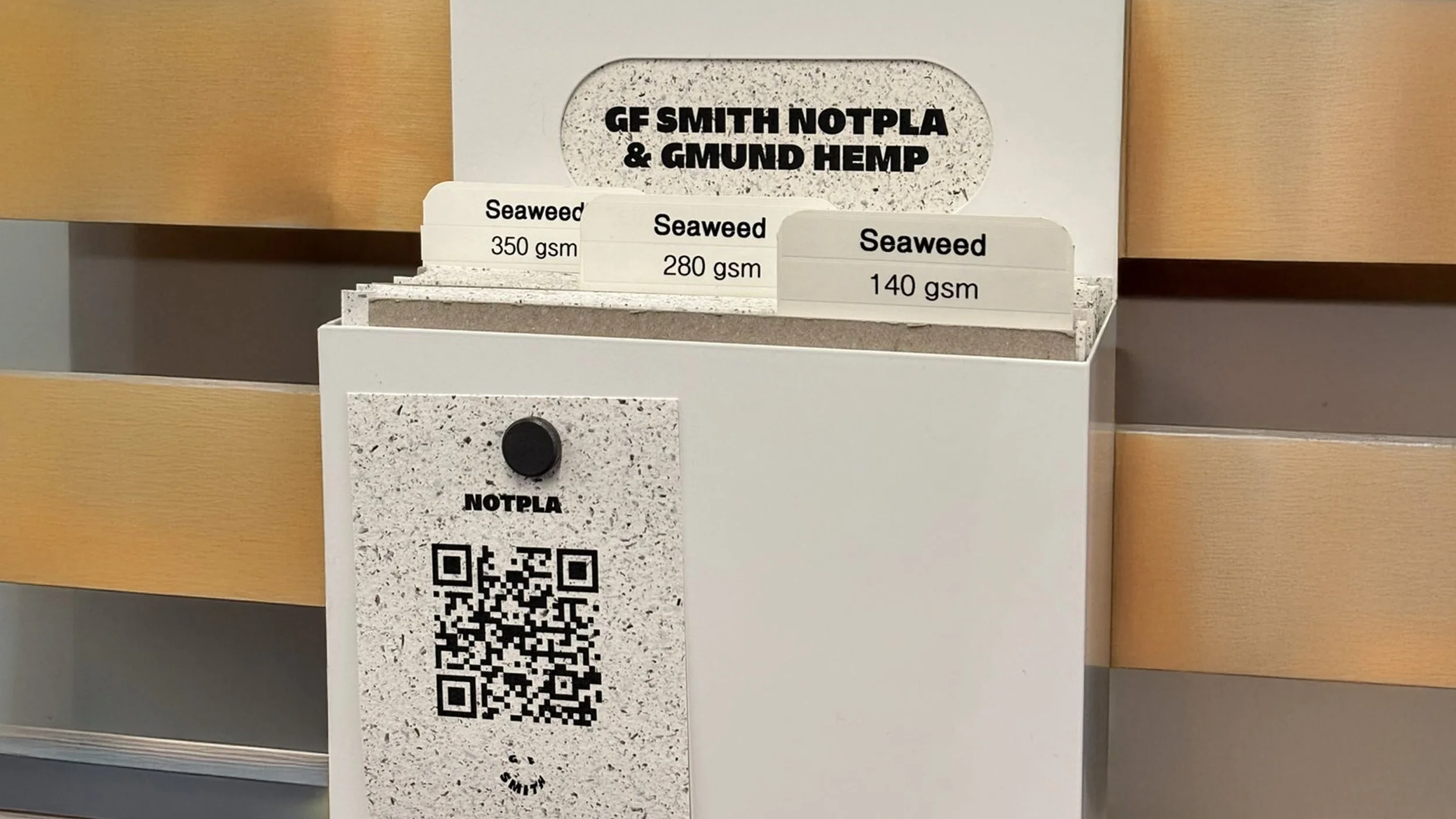 Fig. 4. Biomaterial samples at Central Saint Martins, including food-waste-derived materials (Jing Chen, MA Biodesign) and GF Smith seaweed-based papers.