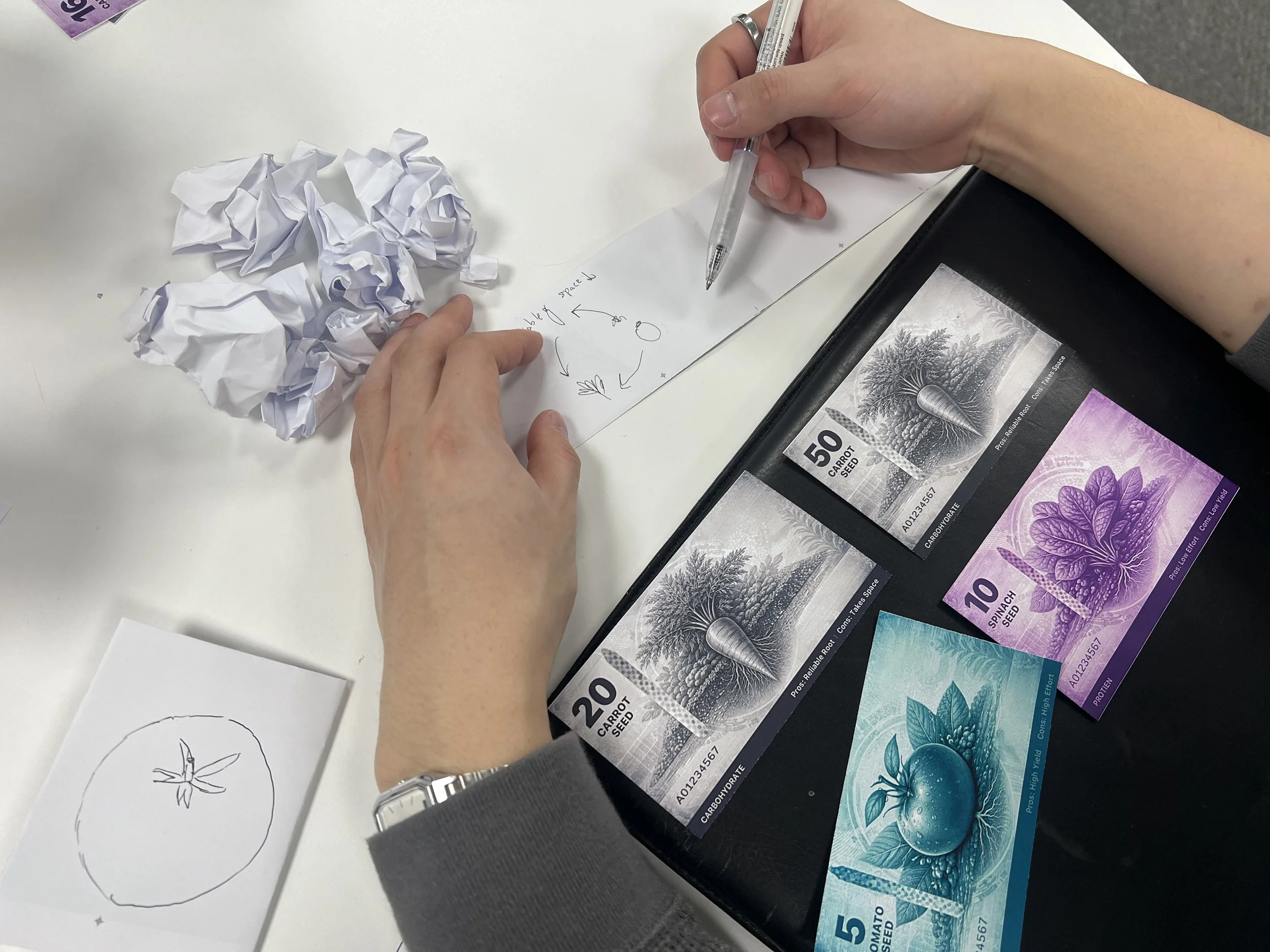 We developed an exchange system based on three vegetables: tomato, spinach and carrot. Each was linked to a different nutritional value, tying value to nourishment rather than price alone. We also introduced seasonality, helping all items retain relative value across cycles. Within this model, currency could either be exchanged for fresh produce or planted to generate more, reinforcing circulation rather than accumulation.