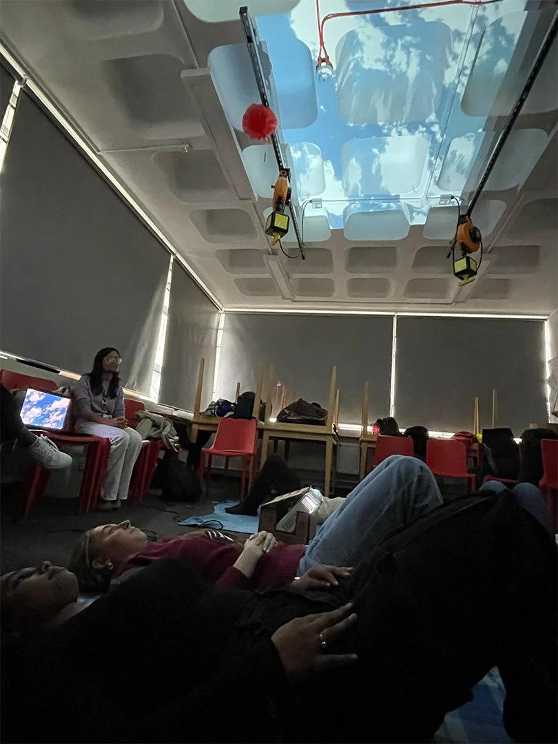 Even though we ran a quick speed-dating exercise, we relied on storyboards, which didn’t fully account for comfort. As a result, our initial idea of asking participants to lift their heads and look up at the sky didn’t work, as the chairs were not comfortable or supportive for the neck, particularly for taller participants.