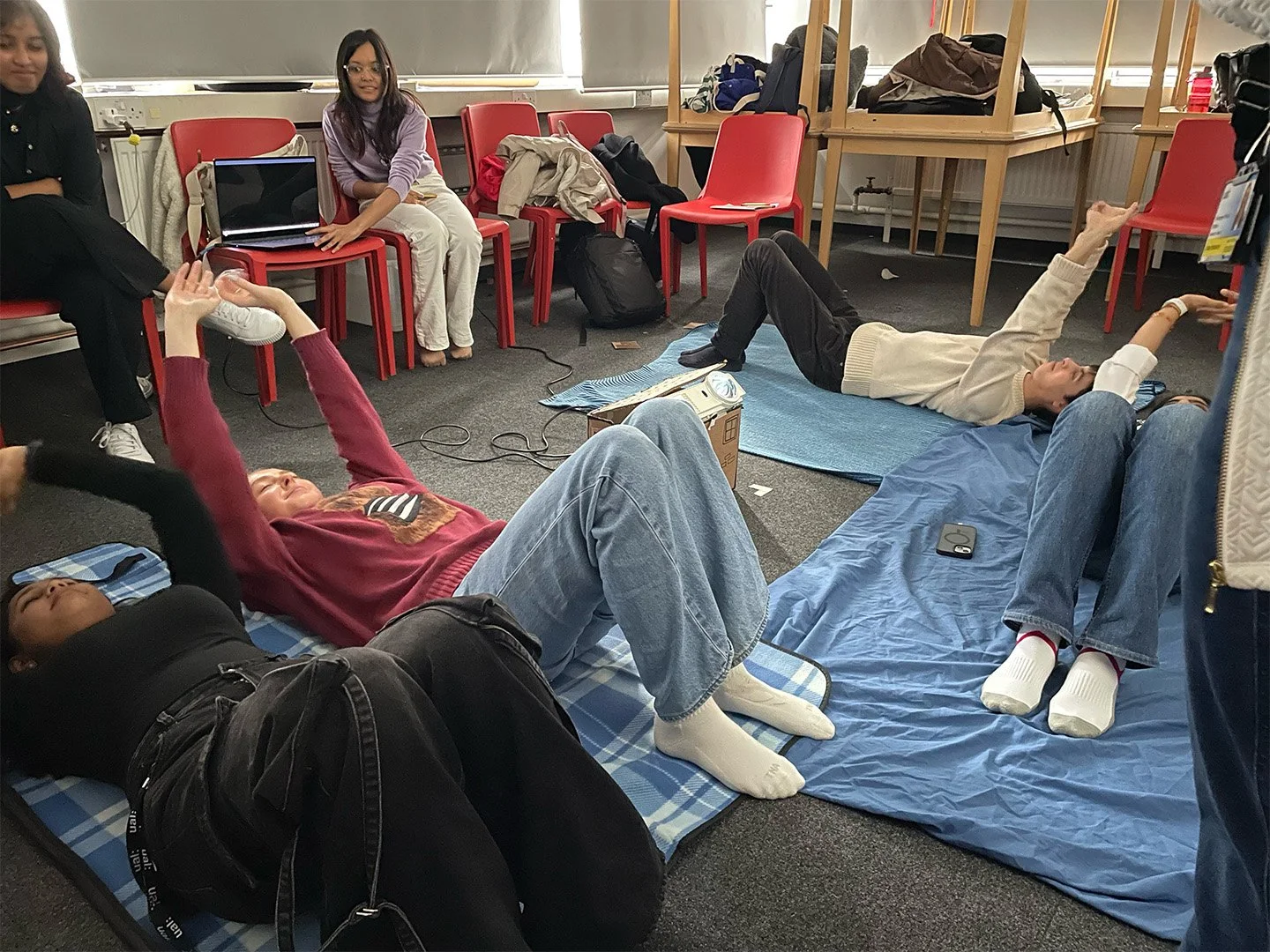 Participants were invited to lie down on picnic mats and imagine themselves as clouds, rising from the floor and feeling weightless.
