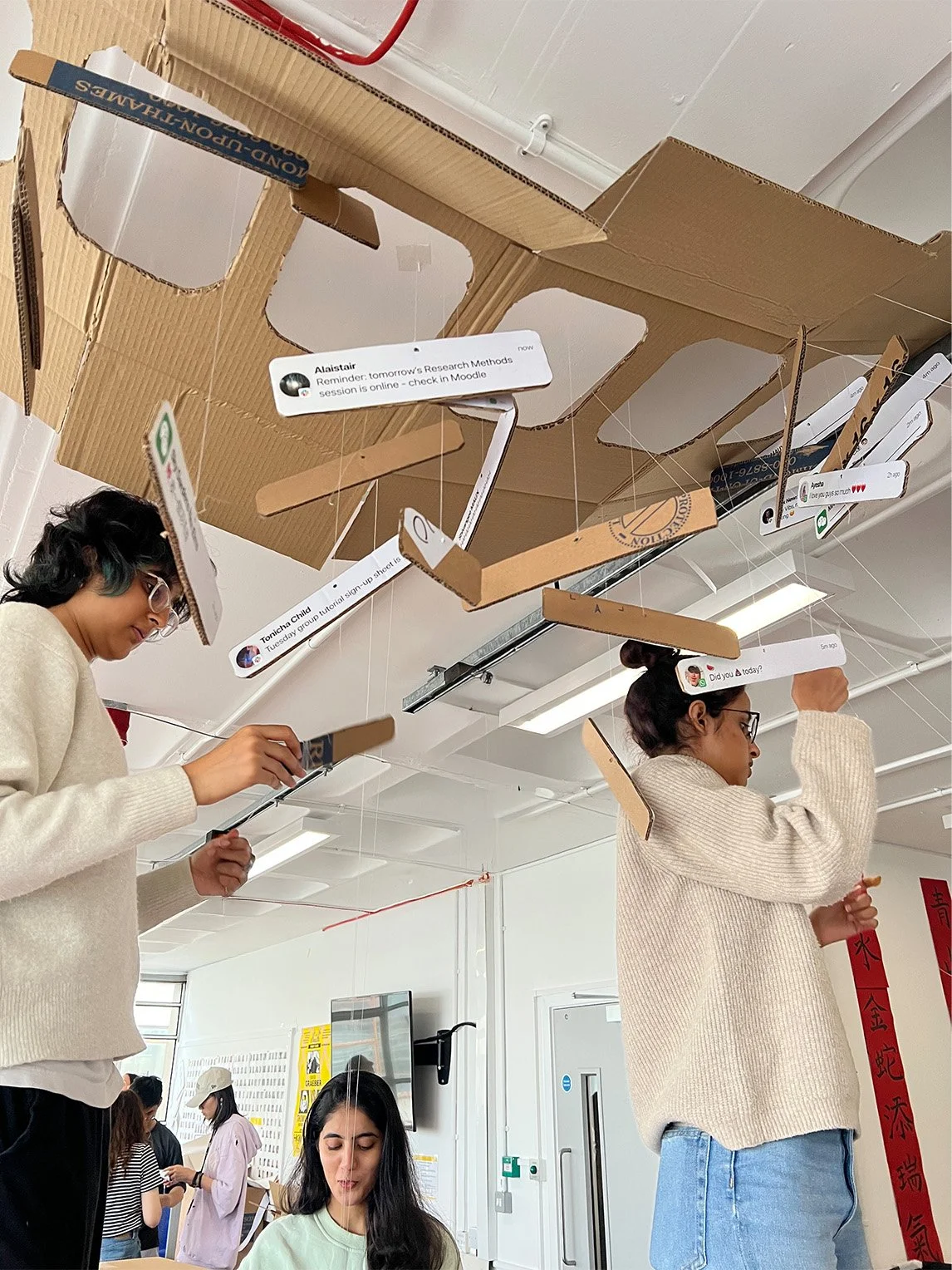 Fig. 5. We attached the cardboard notifications to strings that would drop from the ceiling upon release, photography by author.