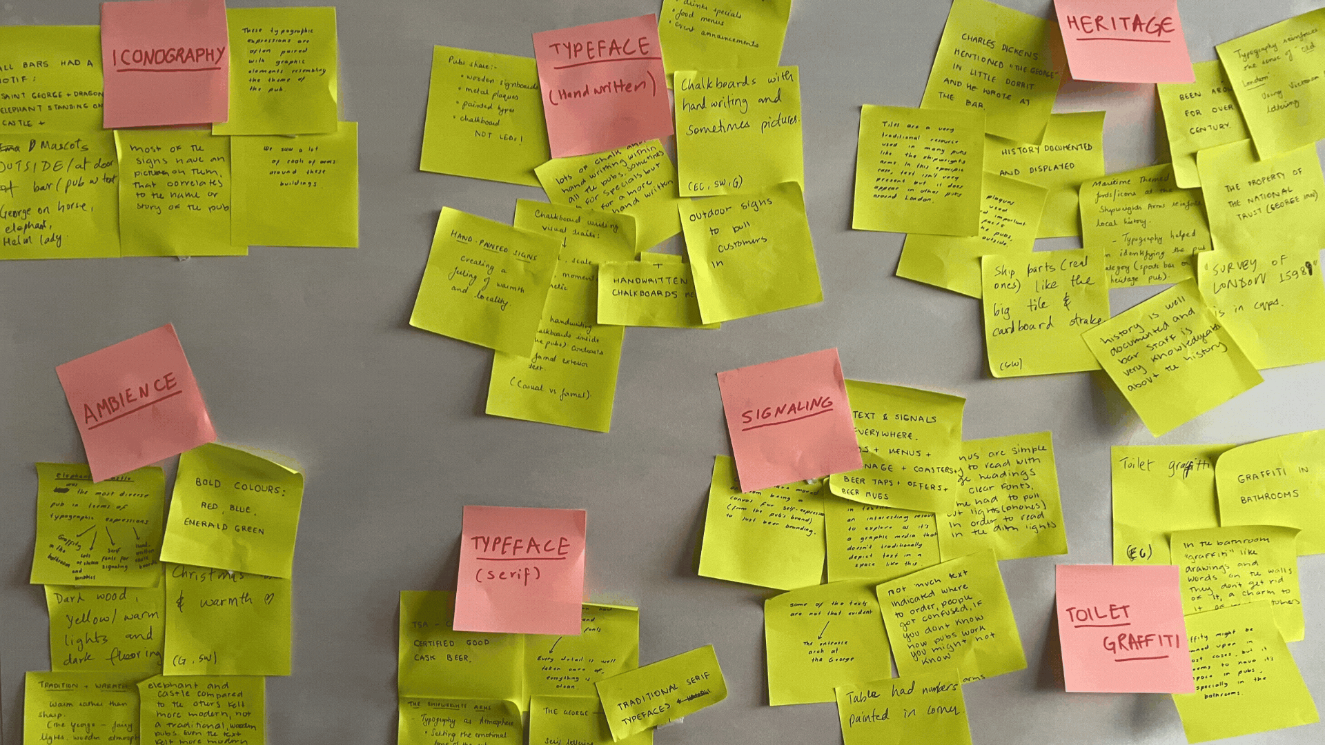 We wrote down our thoughts from visiting the pubs and sorted them into categories. From this, seven themes emerged: iconography, handwritten type, heritage, ambience, serif typefaces, signalling and toilet graffiti. When toilet graffiti appeared on the pink Post-it, the group got excited. It was a space we wanted to explore, but one we hadn’t considered at the start of our research.