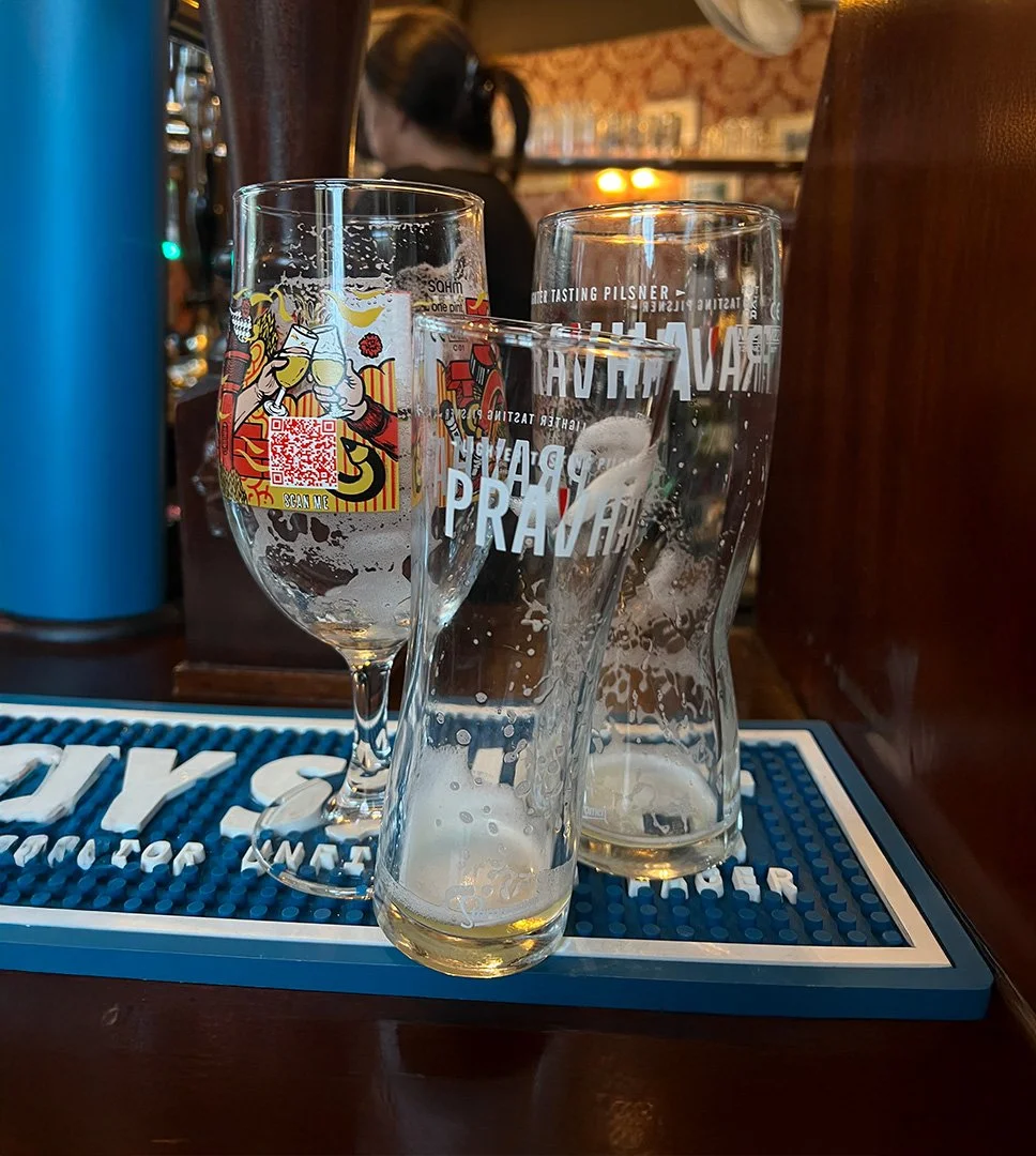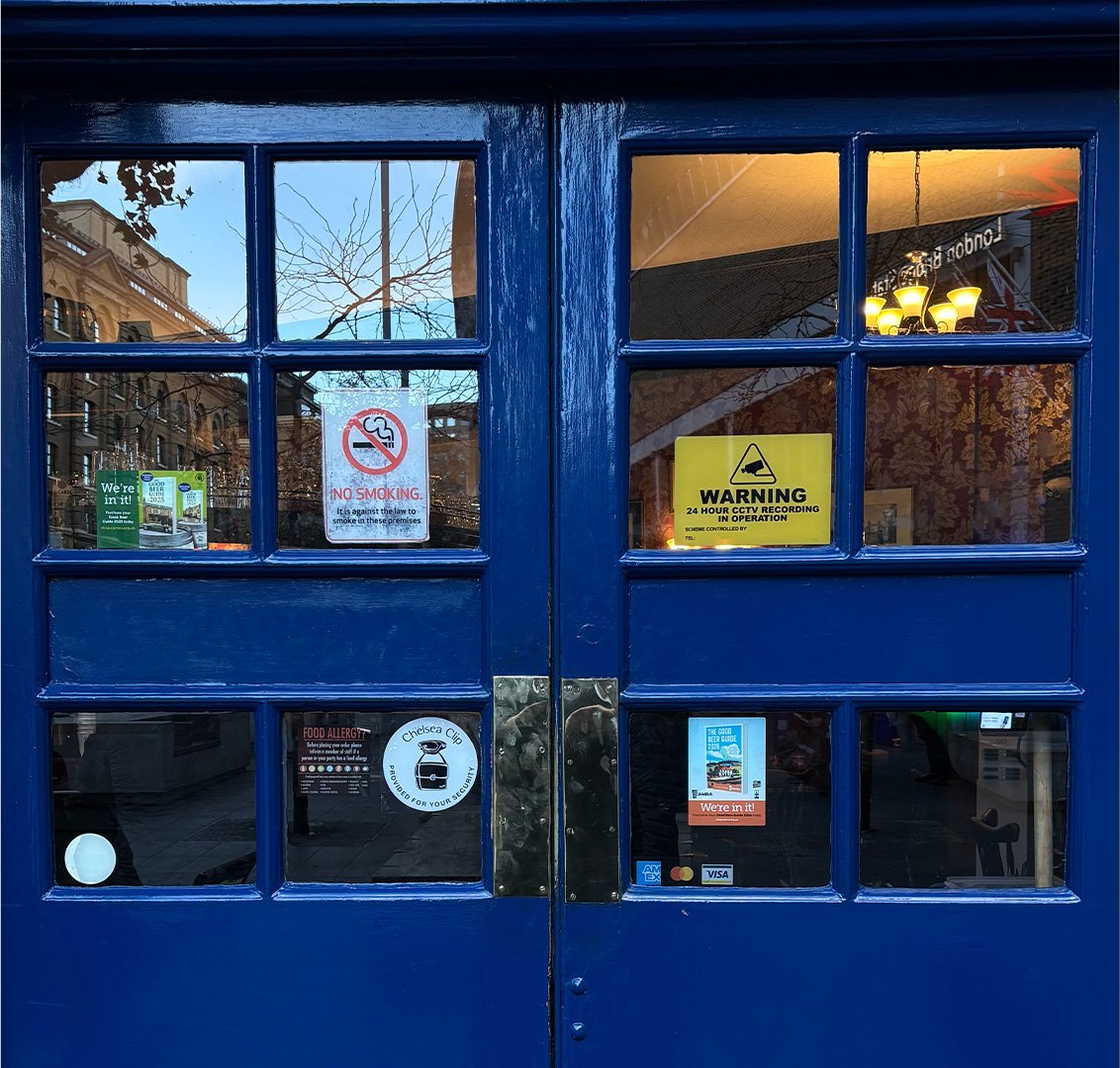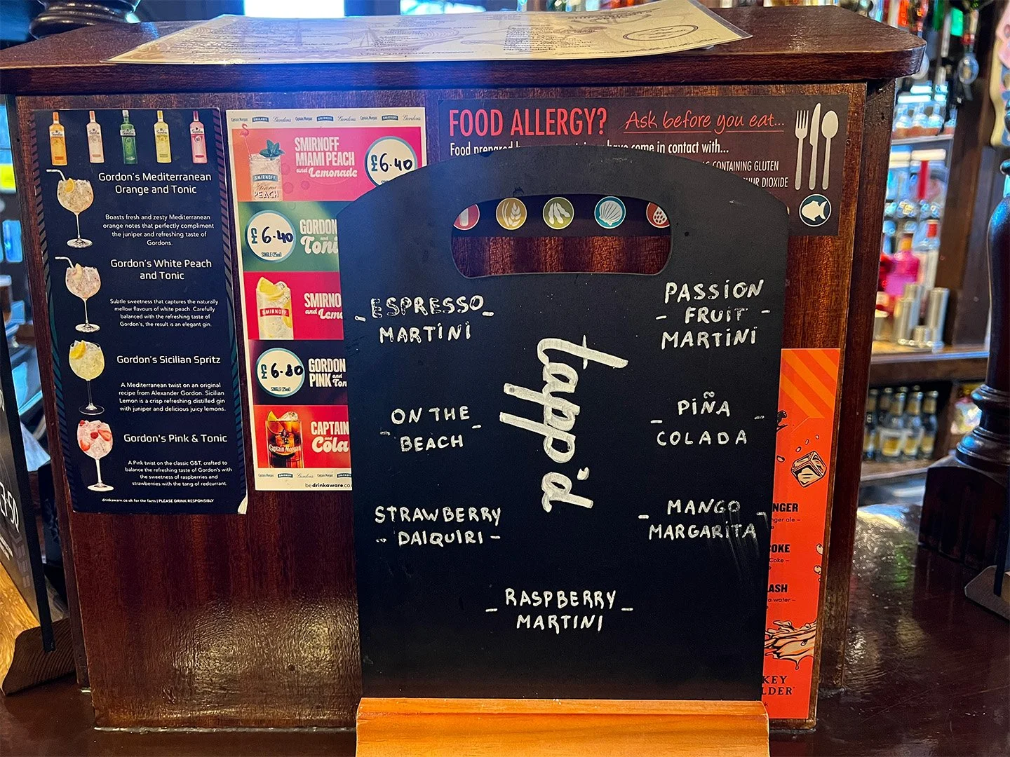 At The Shipwright’s Arms, we found more of what we were been looking for. Traditional hand-painted signage, alongside ship-themed visuals, handwritten chalkboards, advertising discounts and card payments stickers, branded beer mats, coasters, glasses and labels.
