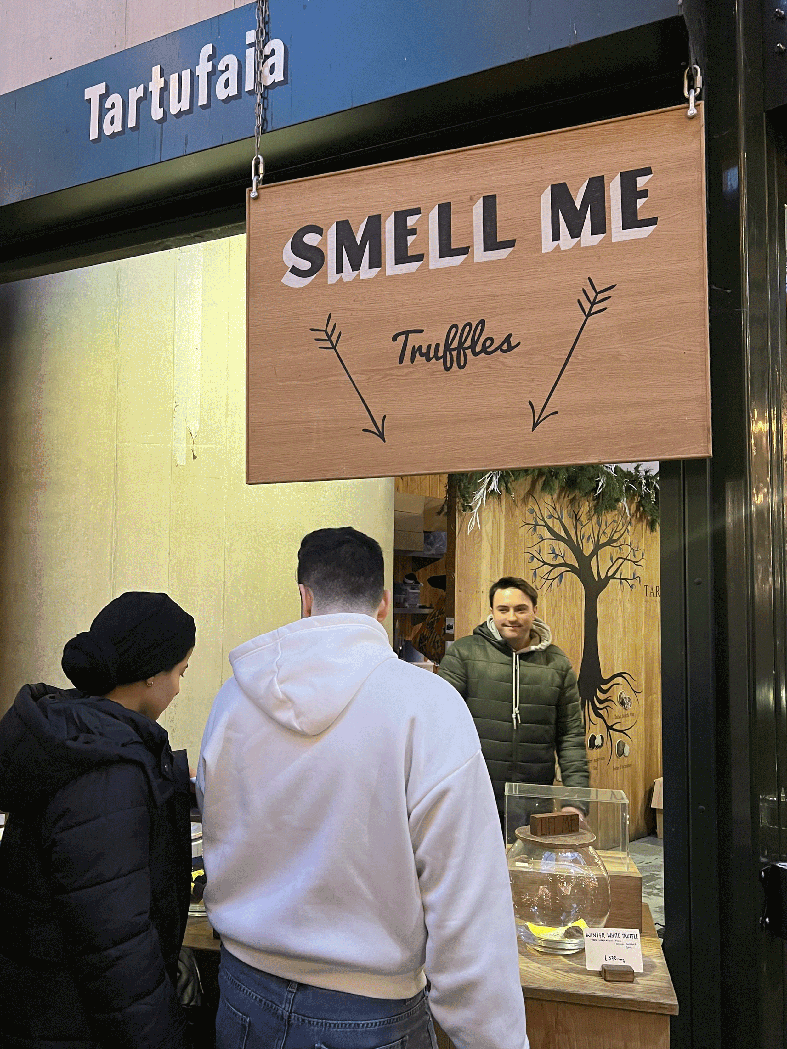 The group briefly discussed Counter Service NY’s viral billboard that simply read “Sandwiches”, with an arrow pointing towards the shop. While walking through Borough Market (Fig. 3, middle), we saw the same mechanic play out. A sign reading “Smell me” pointed to the truffles, and people actually did. There’s something powerful in the simplicity of an instruction.
