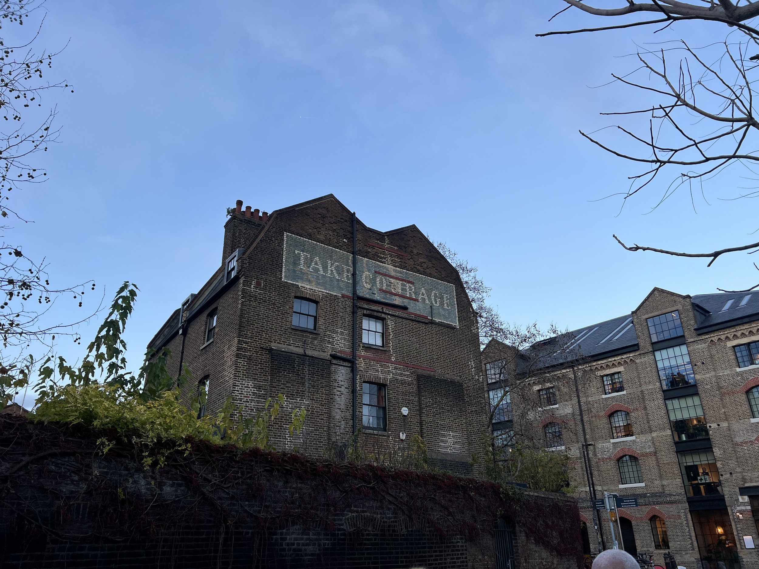 Next, we visited the George Inn, which Charles Dickens is said to have frequented. It felt traditional, yet more elegant than The Shipwright’s Arms. We also learned that many British pubs were given simple names and visual motifs, such as The Red Lion or The Crown, so they could be easily recognised at a time when literacy was low. After, we came across the “Take Courage” ghost sign, a reminder of how text can endure in the city.