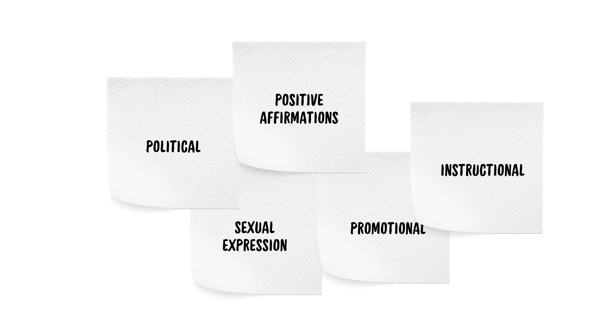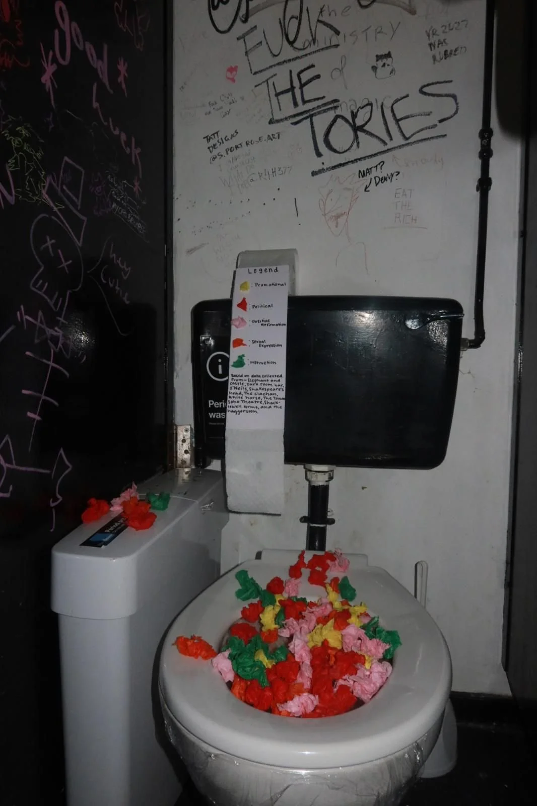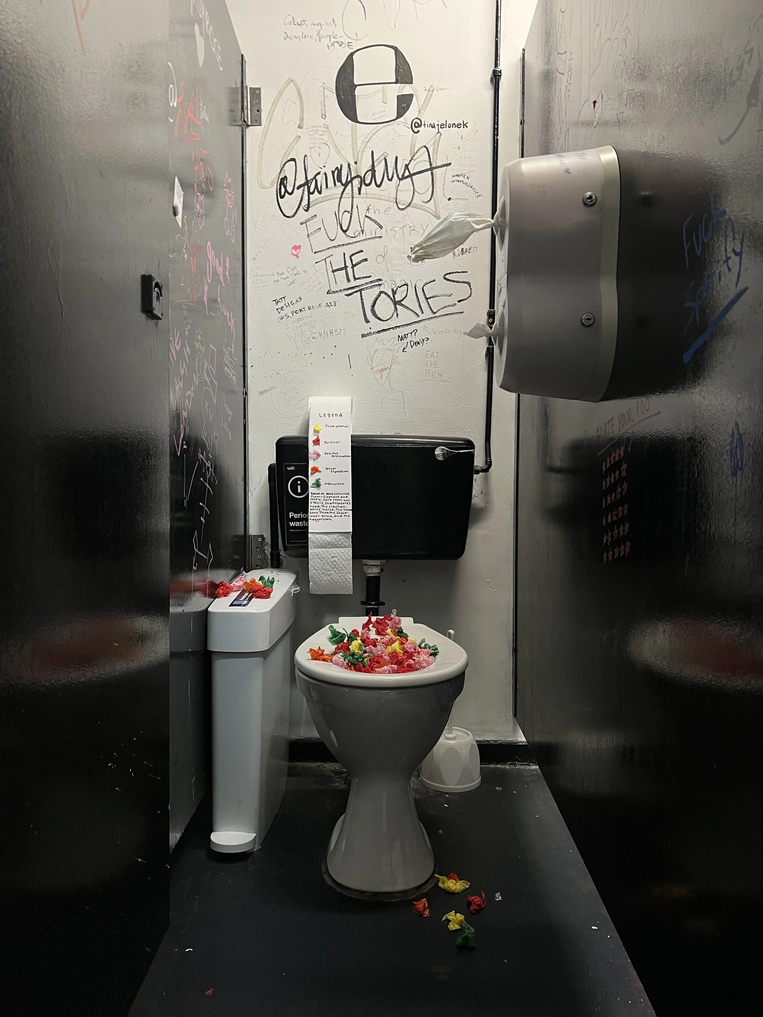 We coded these five themes: political, sexual expression, positive affirmations, promotional and instructional, using different colours of tissue-like paper and headed to the toilets to photograph our data physicalisation. Our legend was written on a toilet roll and we cellophaned the toilet seat to hold the tissues.