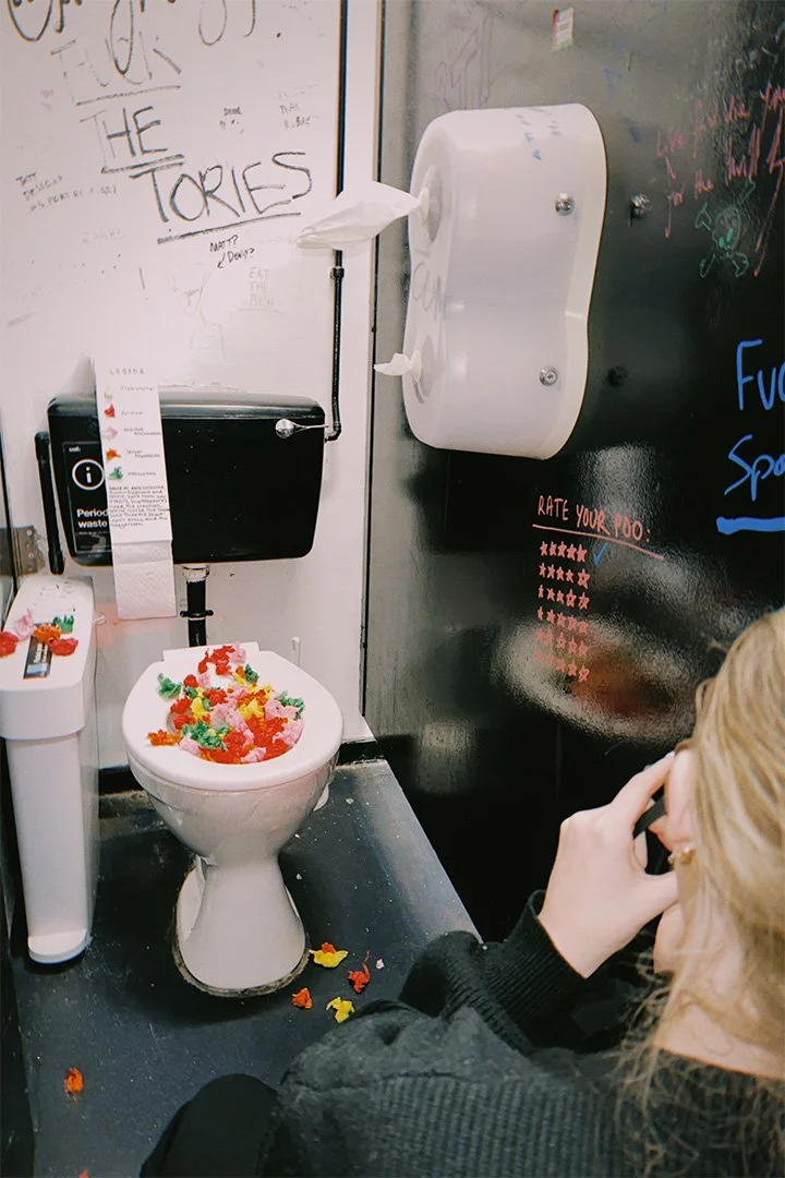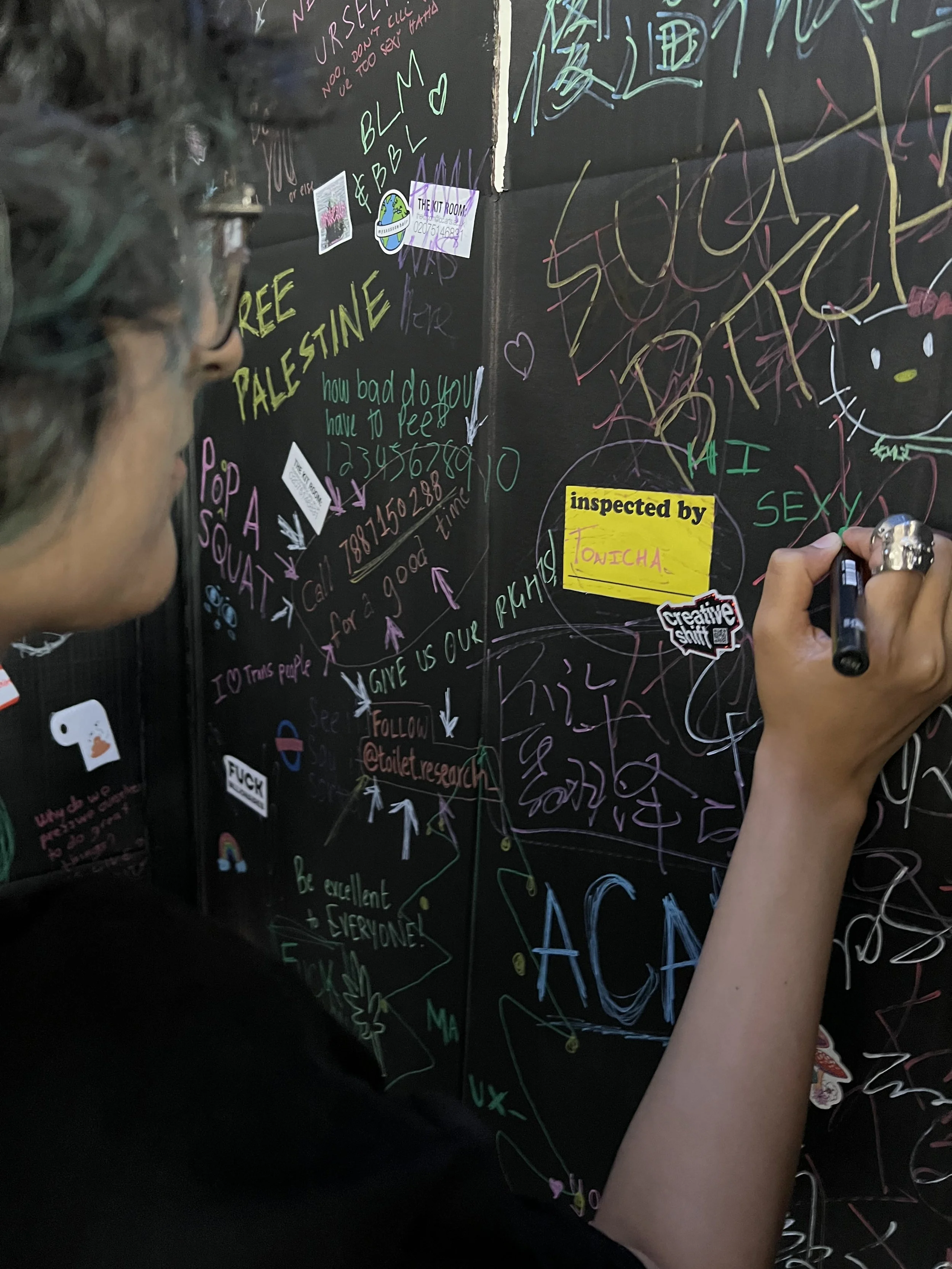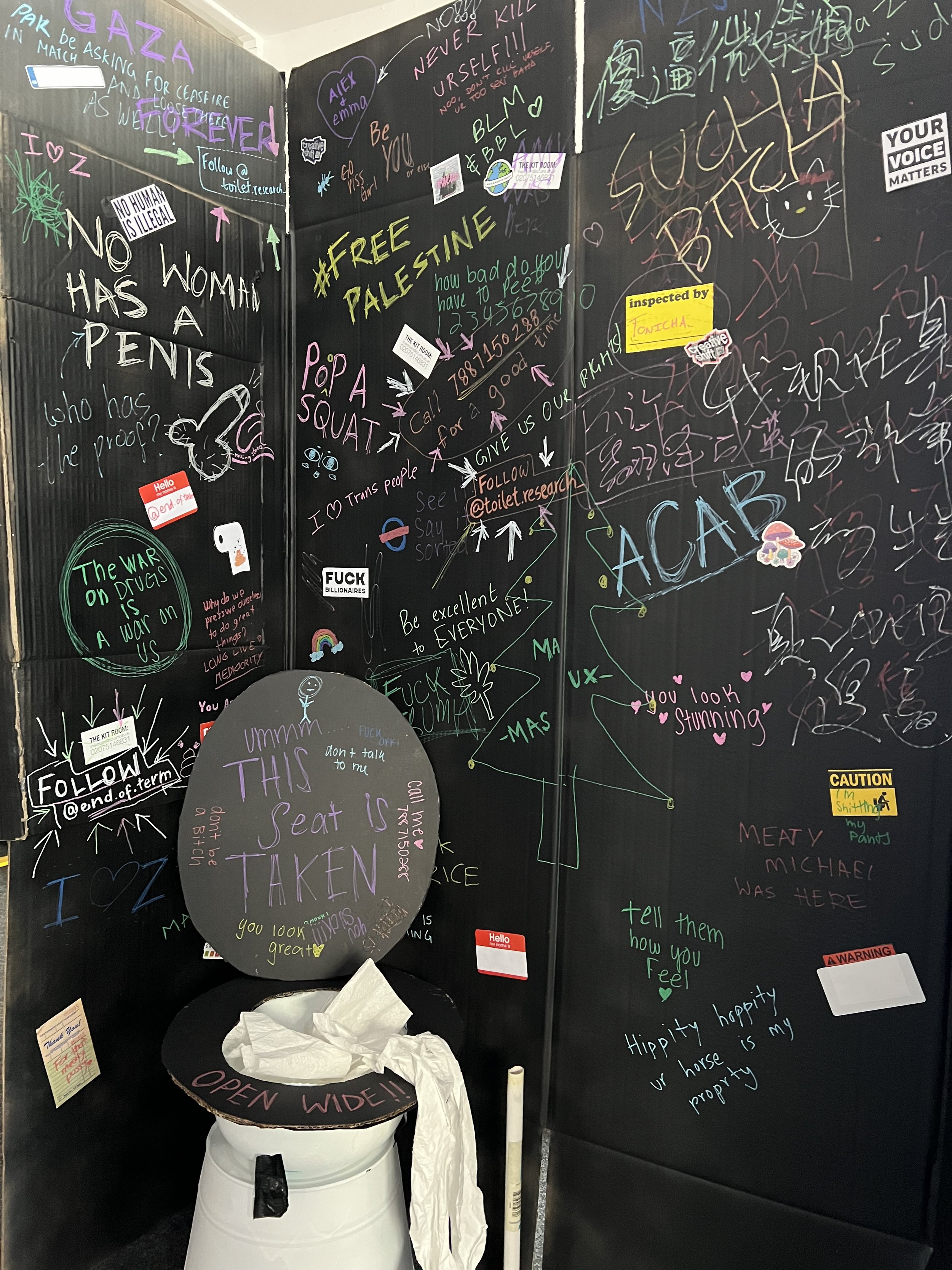We made a toilet stall! It was an interactive space with a door for privacy, inviting people to step inside and contribute to the dialogue within. Rather than starting with a blank space, we added a few markings of our own to initiate participation. The stall also featured interactive elements to engage with, alongside ambient sounds, music and recorded party conversations, adding to the overall experience.