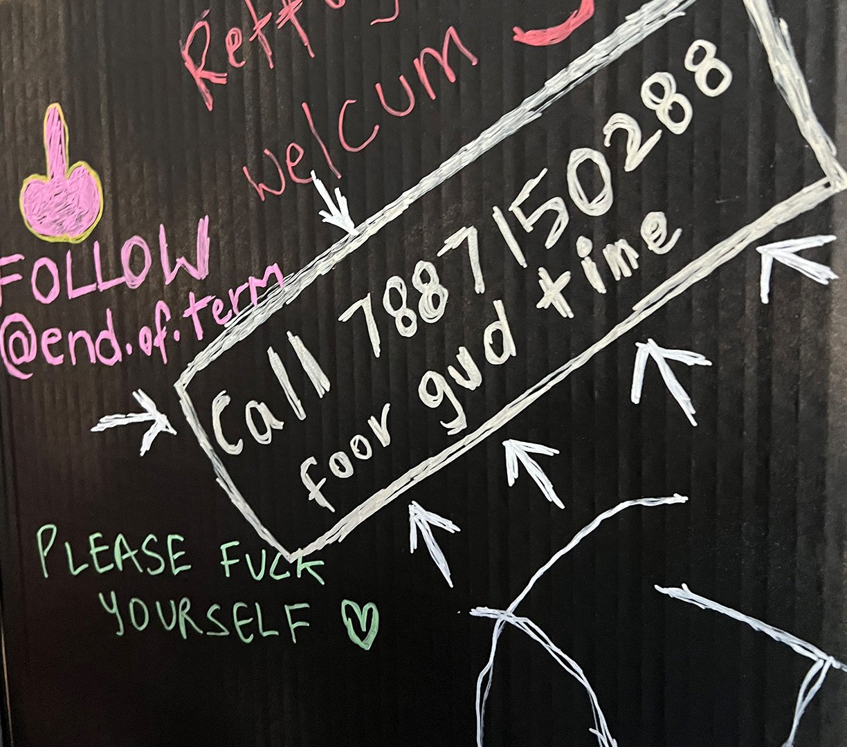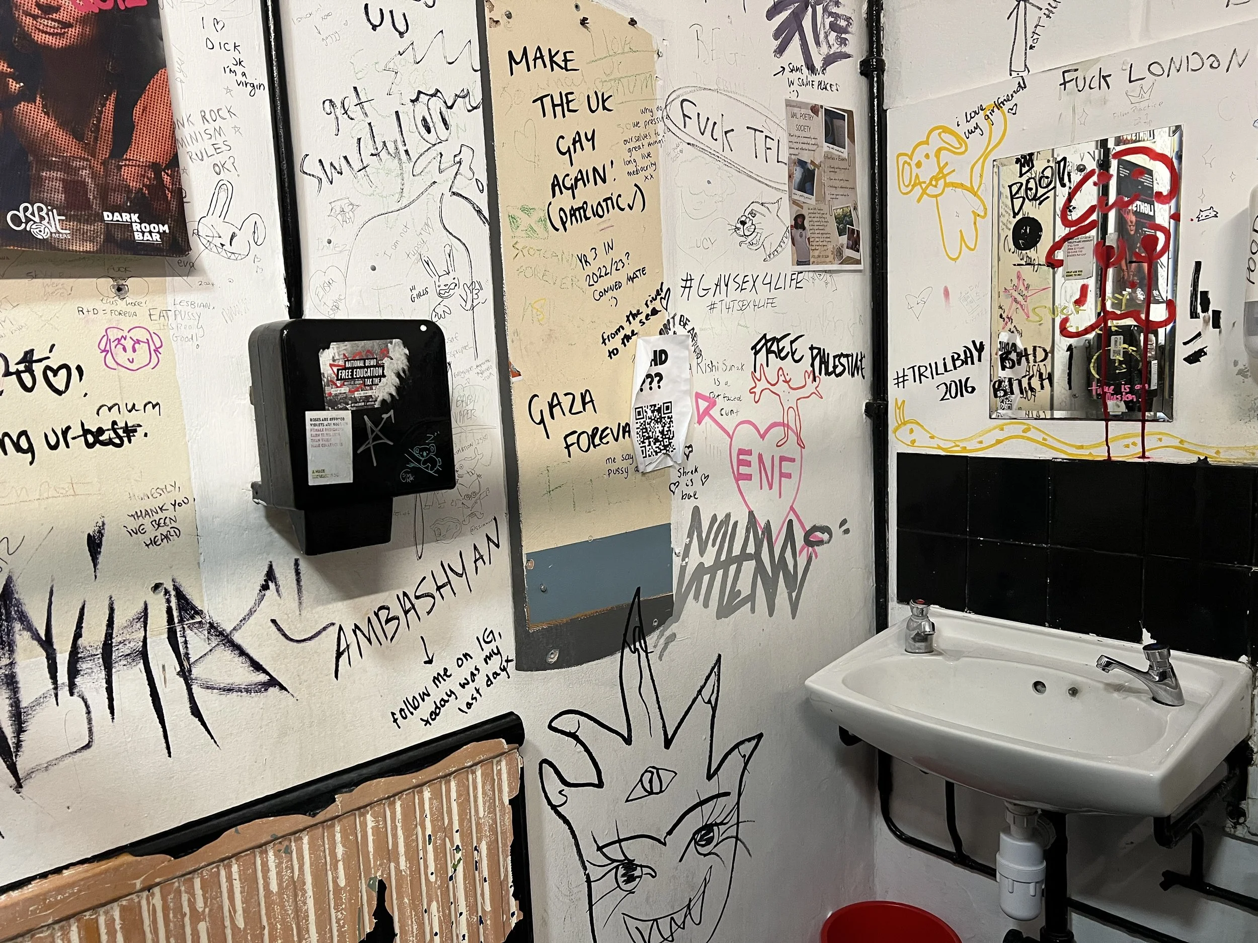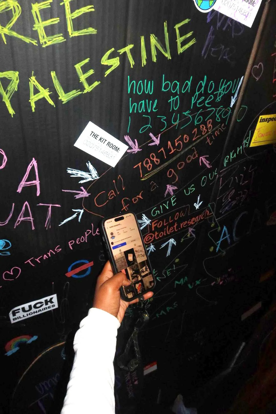 Borrowing from the toilets we observed, we added surprise interactive elements within the toilet stall. These included an Instagram handle (@toilet.research) linked to our latrinalia research, another directing users to an account celebrating the end of term (@end.of.term) and a phone number that could be called for a “good time”, with our teammate Vibhooti on standby.